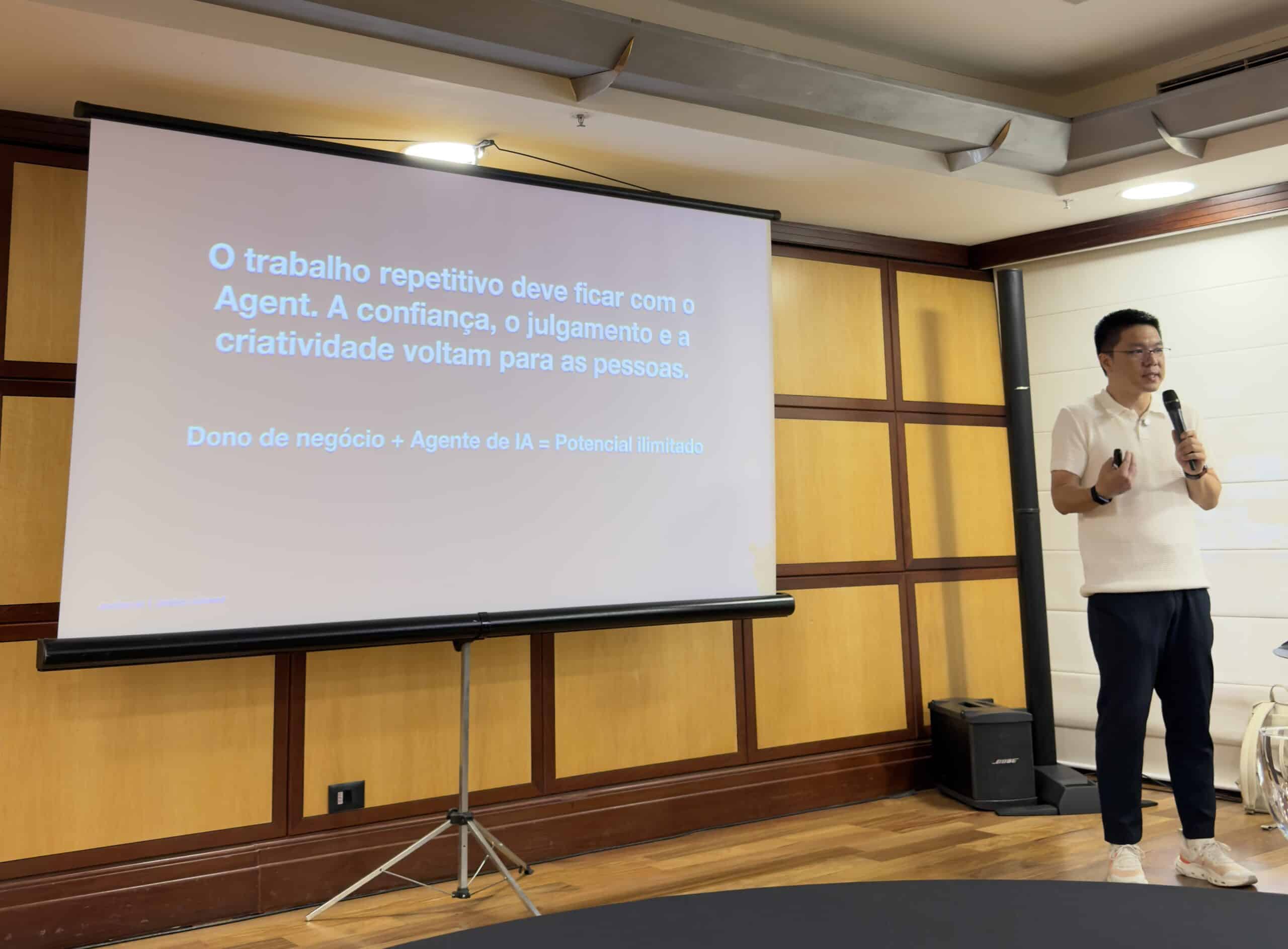 “Dono de negócio + Agente de IA = Potencial ilimitado” — Slide apresentado por Leo Huan no evento